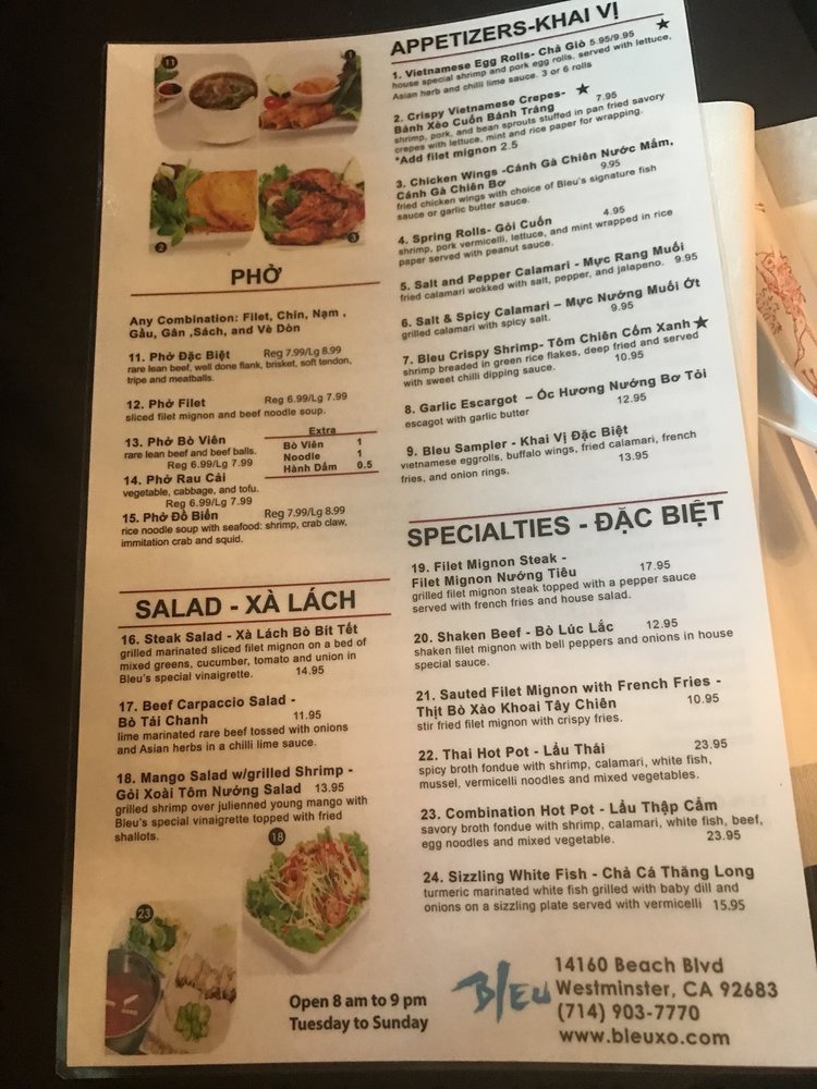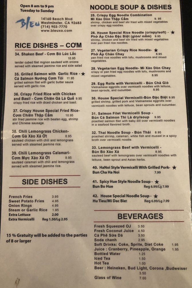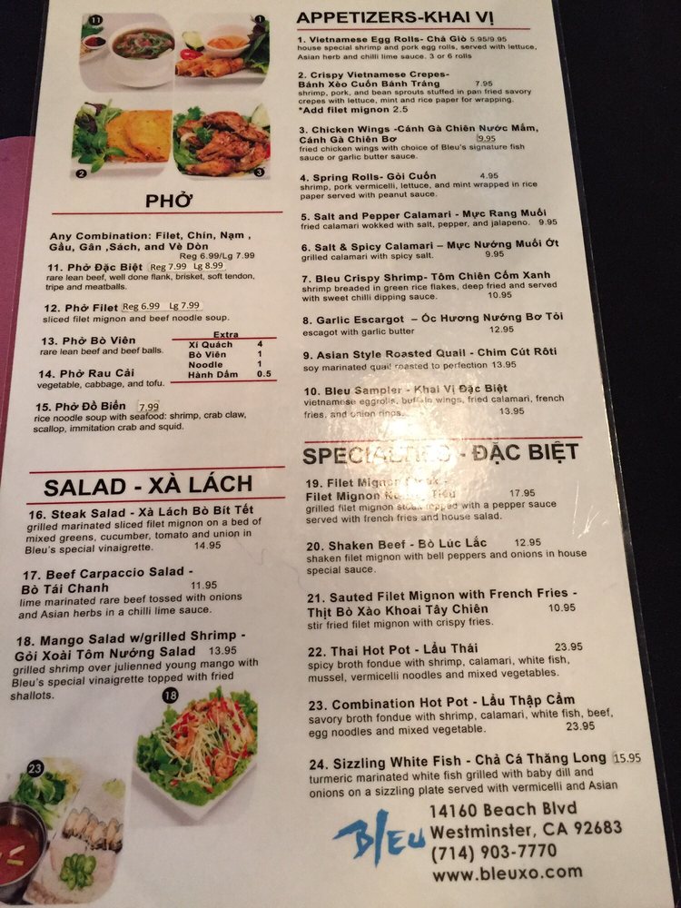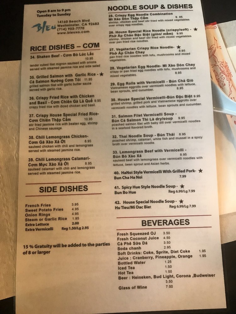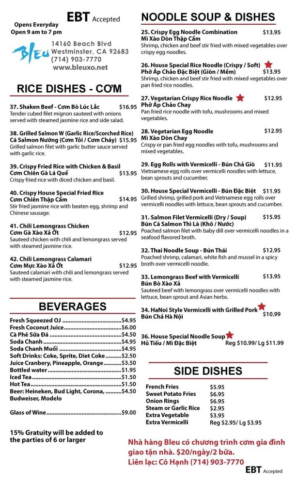 Welcome to Bleu, where vibrant Vietnamese cuisine meets a welcoming atmosphere. Nestled in the heart of Westminster, California, at 14160 Beach Blvd, Bleu is not just another eatery; it's an experience. This Asian-owned gem takes pride in offering an extensive menu that caters to all palates, including numerous vegetarian options. Whether you're stopping by for lunch, a late-night bite, or looking to host a special event, Bleu has got you covered.