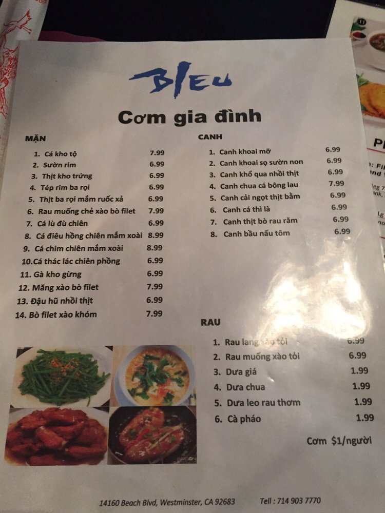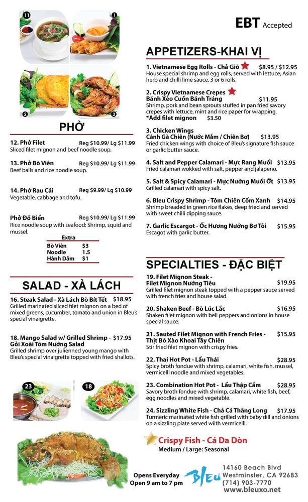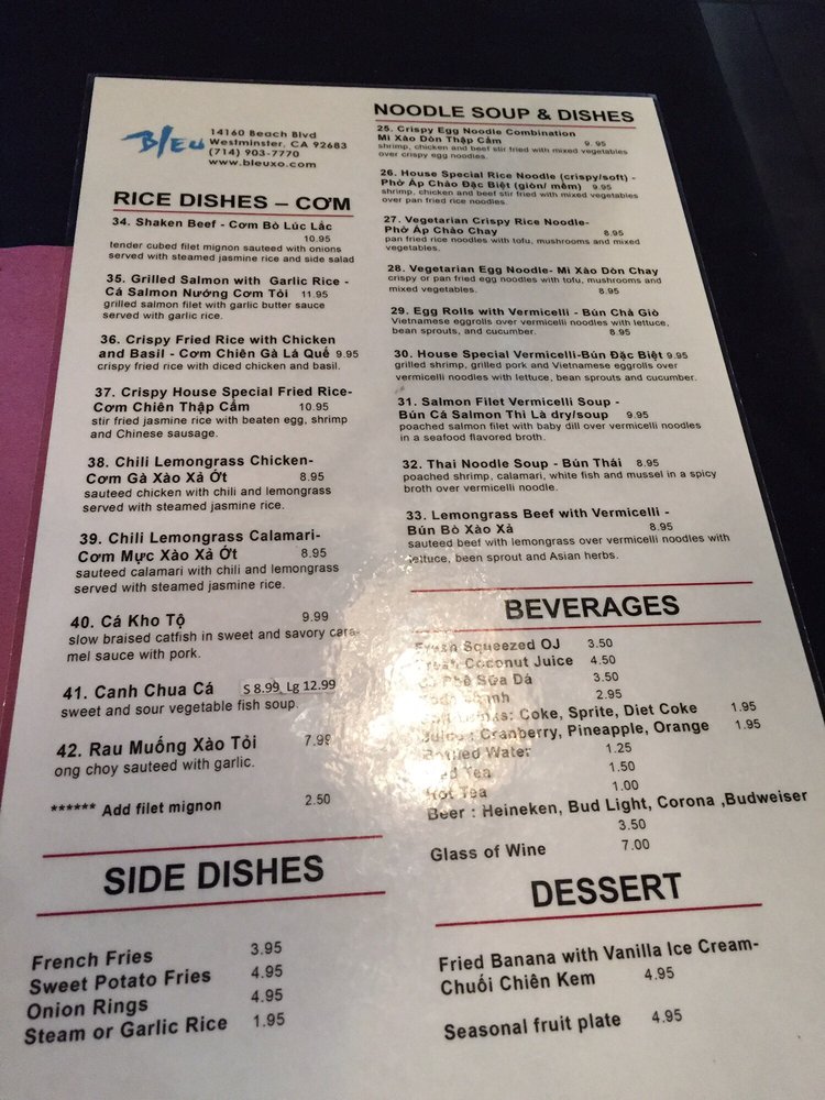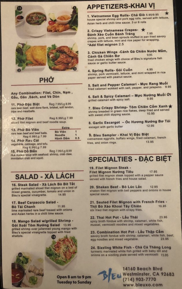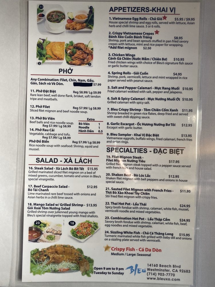 Welcome to Bleu, where vibrant Vietnamese cuisine meets a welcoming atmosphere. Nestled in the heart of Westminster, California, at 14160 Beach Blvd, Bleu is not just another eatery; it's an experience. This Asian-owned gem takes pride in offering an extensive menu that caters to all palates, including numerous vegetarian options. Whether you're stopping by for lunch, a late-night bite, or looking to host a special event, Bleu has got you covered.